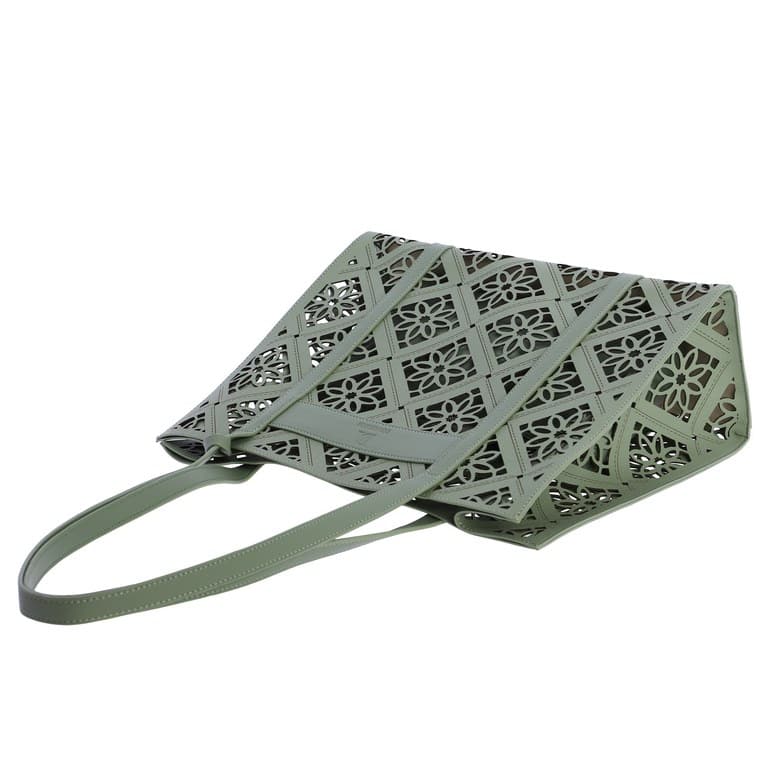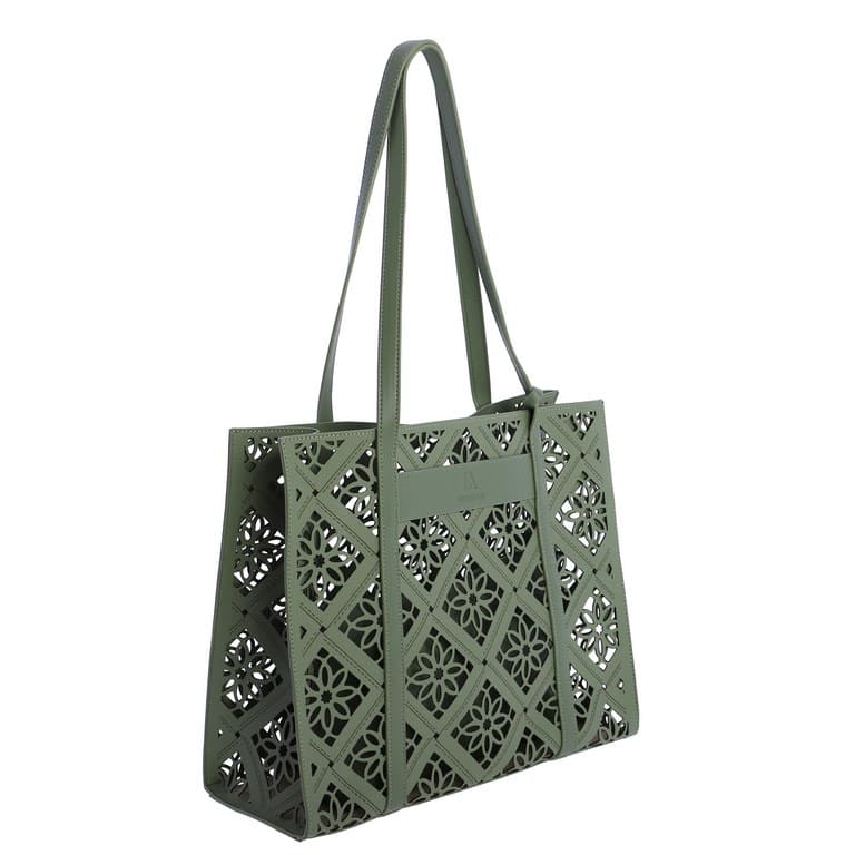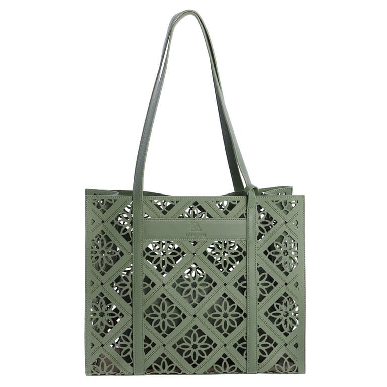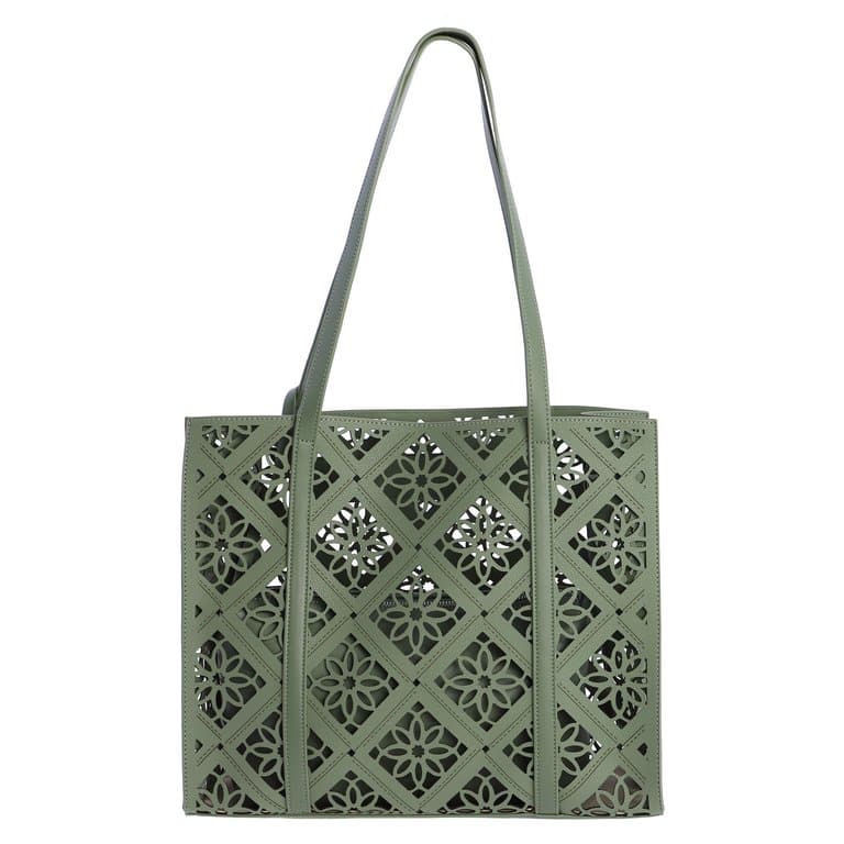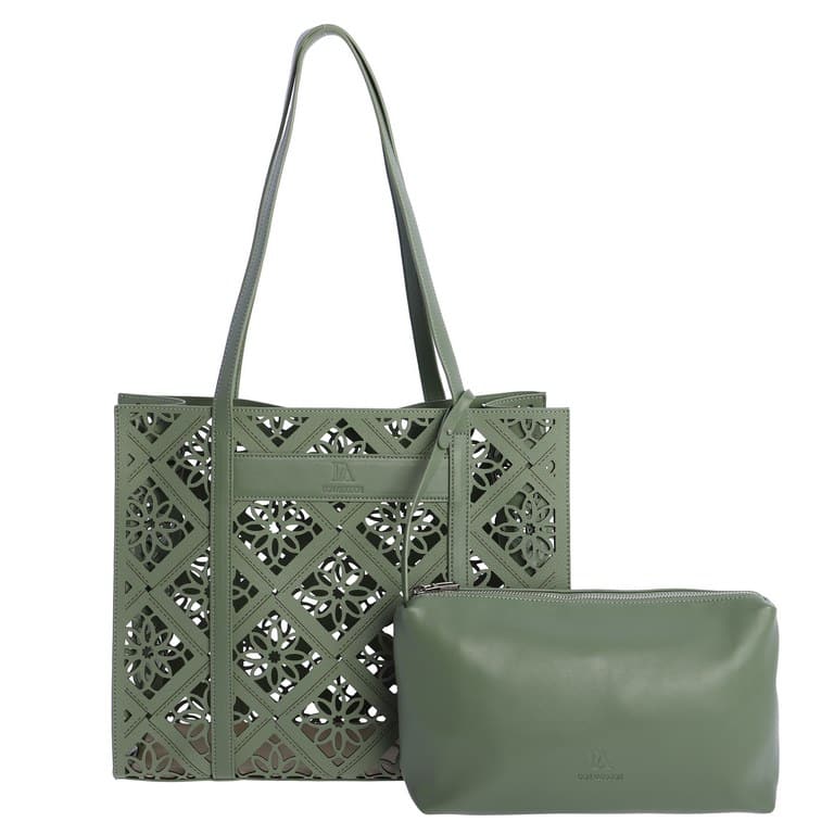 Bolso de Hombro verde Don Algodón 0SV7845005, Es un bolso de hombro de estilo calado, con un patrón decorativo troquelado que le da un aire fresco y veraniego. El color verde aporta un toque luminoso y combinable, manteniendo la estética ligera típica de Don Algodón. Bolso interior: incluye un neceser interno con cremallera, que puede extraerse y utilizarse por separado. Medidas del neceser: 30 × 18 × 7 cm. El bolso exterior es abierto, pero el neceser interior asegura el contenido son su cremallera.
