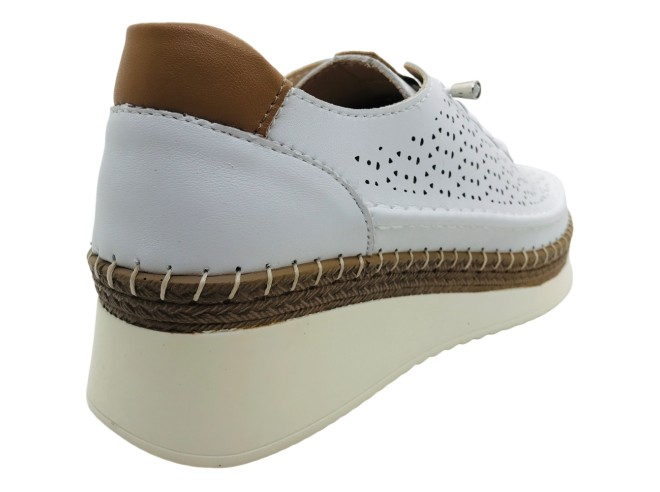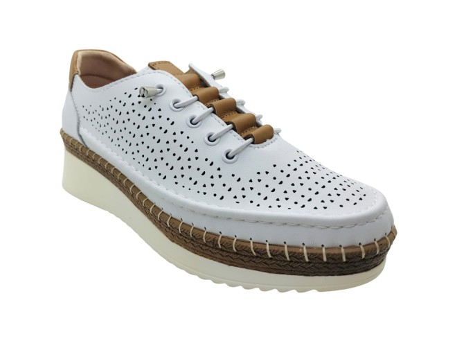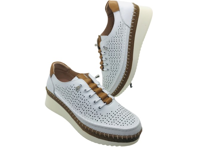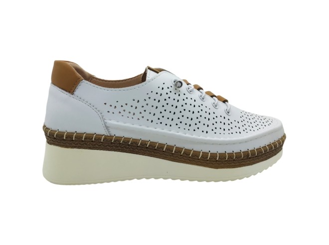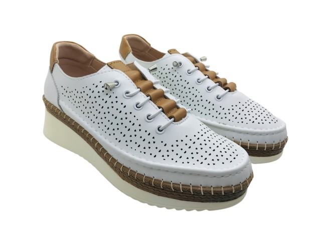 Zapatilla Deportiva con cuña Platino Rosa Amada, Zapatos con cordones elásticos tipo snikers de piel con picados en color blanco de la marca rosamada , supercomodos y faciles de poner. Ideales para tu día a día. Son muy muy ligeros.