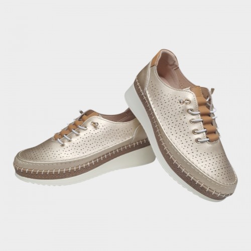 Zapatilla Deportiva con cuña Platino Rosa Amada, Zapatos con cordones elásticos tipo snikers de piel con picados en color platino de la marca rosamada , supercomodos y faciles de poner. Ideales para tu día a día. Son muy muy ligeros.