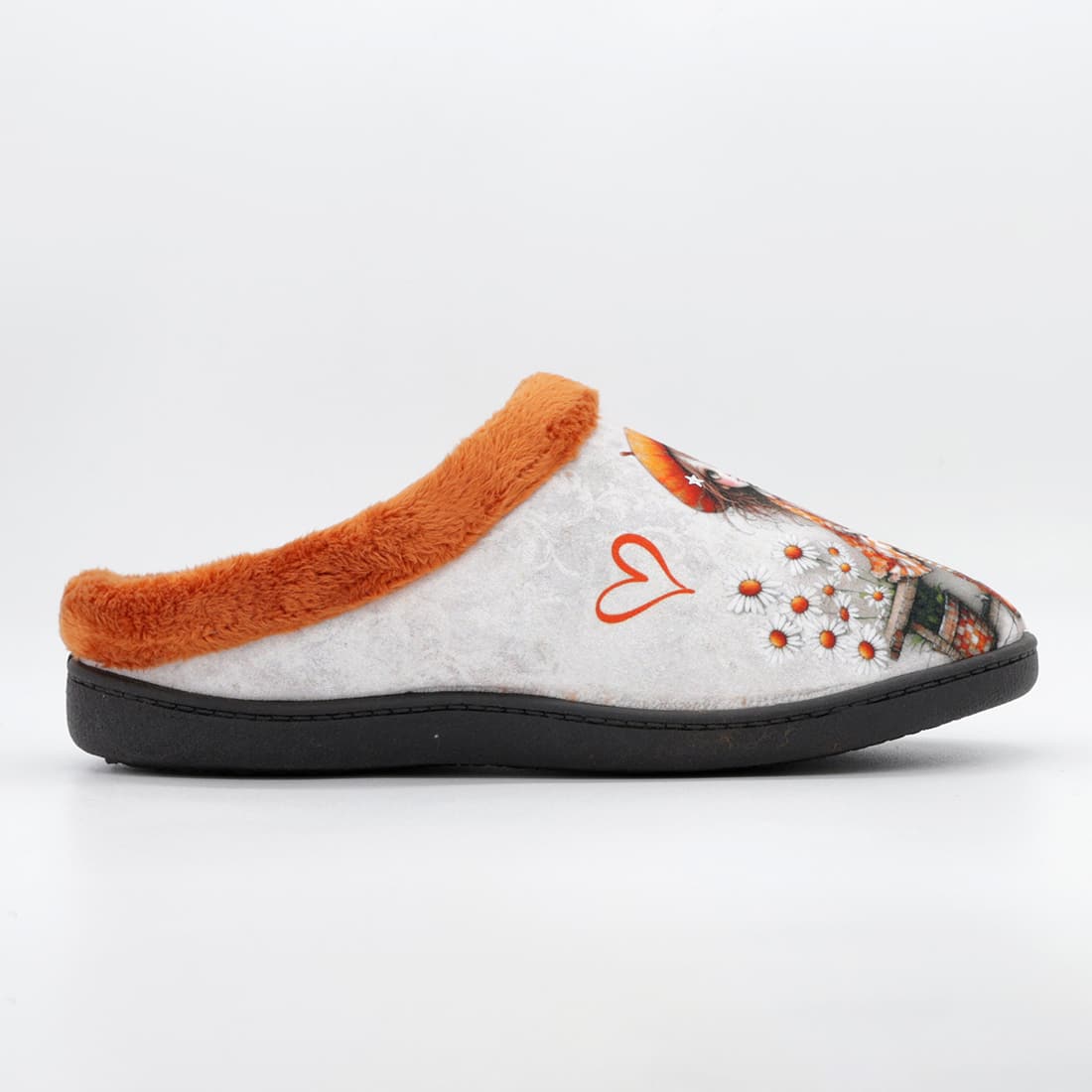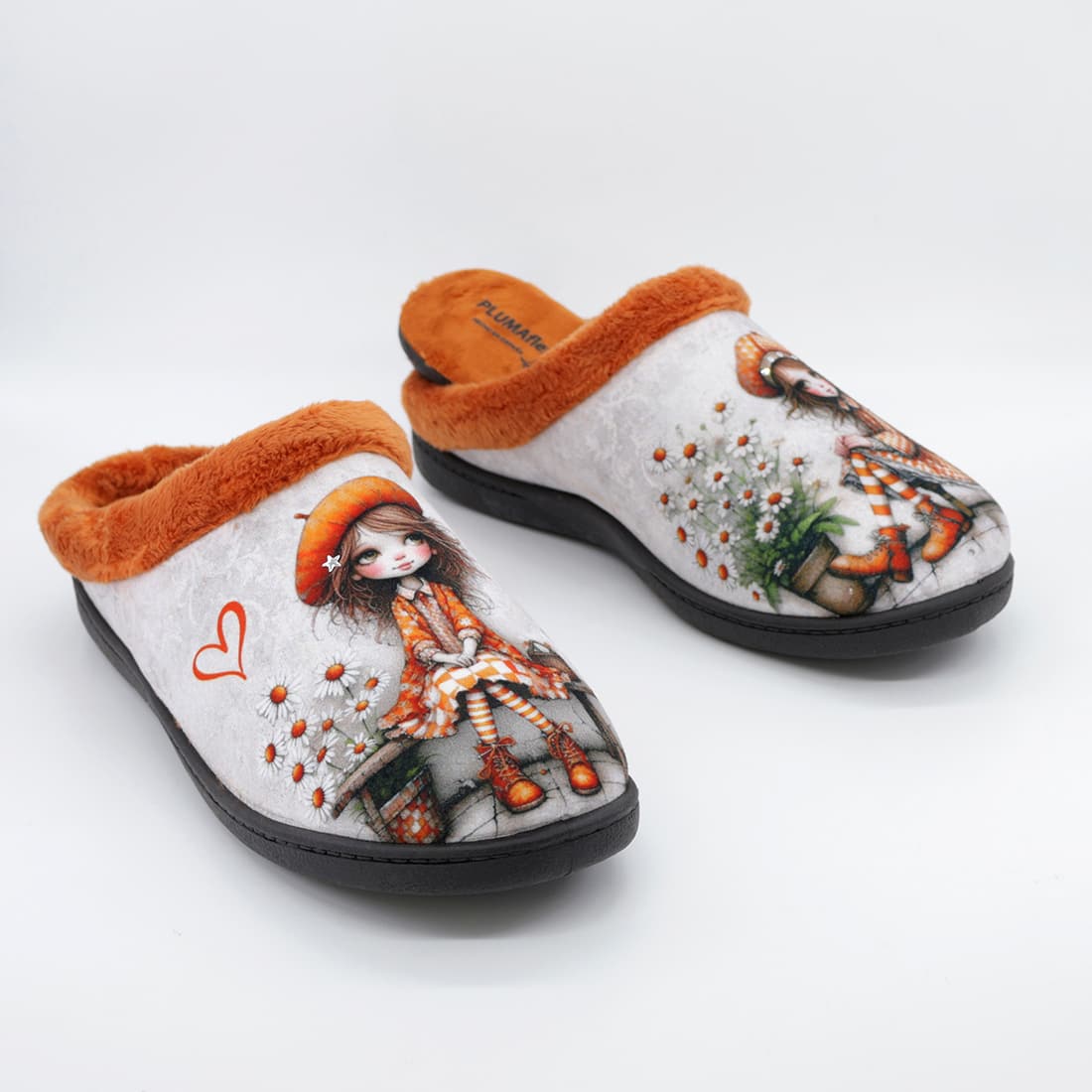 Zapatillas de Casa Plumaflex Chica margarita 12213, son unas zapatillas hechas a mano y fabricadas 100% en España en tejido súper suave. Original y elegante diseño de una niña sentada en el campo de otoño con esos colores naranjas. Incluye plantilla extraíble acolchada Plumaflex que se adapta completamente a la anatomía del pie. ¡Confort extra al caminar!